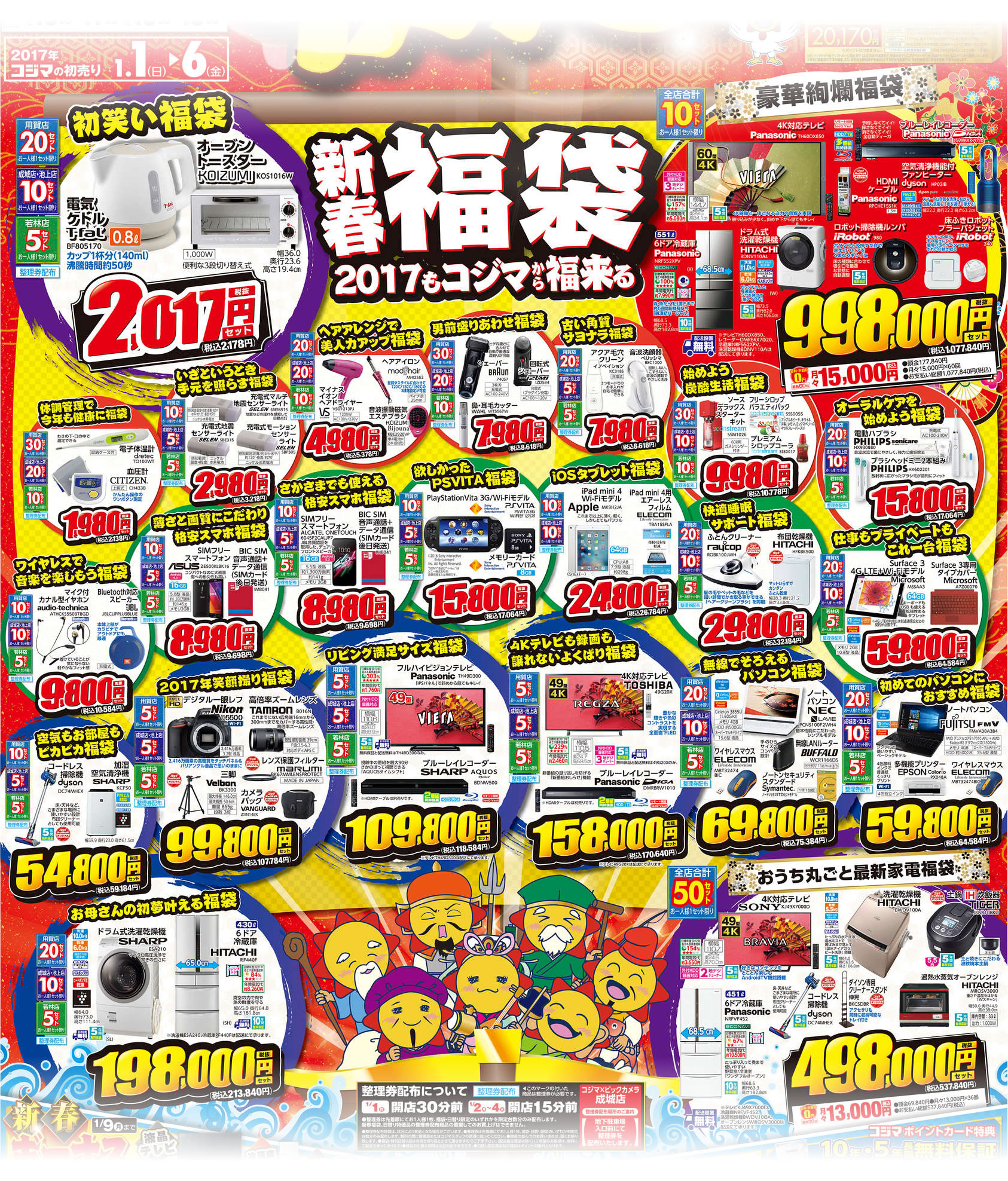 家電/PC2016.12.31 管理人 2017年新春コジマ福袋の中身発表! ツイート シェア はてブ LINE Pocket 家電量販店コジマの新春福袋の内容が発表されました。 用意されている福袋の種類や個数などは店舗によって異なりますので、ご来店予定の店舗で確認して下さい。 ビックカメラグループの傘下に入ったコジマですが、福袋の内容もビックカメラとよく似ています。店舗数も多いのでビックカメラに行くより目当ての福袋がゲットできる確率が高いかもしれません。 ▼画像クリックで拡大画像 関連リンク コジマ 公式サイト この記事が気に入ったら いいねしよう! 最新記事をお届けします。 ツイート シェア はてブ LINE Pocket feedly