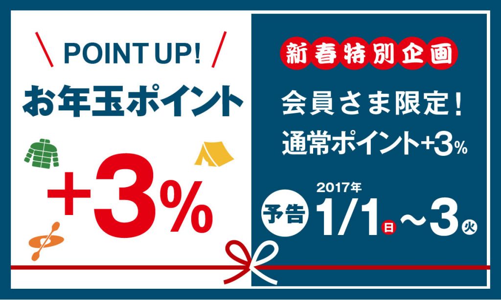 2017年のお正月三が日は、会員さまへ日ごろの感謝を込めて、「お年玉ポイントプレゼント」を実施します。モンベルストアおよびオンラインショップでのお買い物に対して、通常ポイントに「+3%」のお年玉ポイントが付与されます。