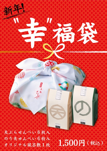 「築地ちとせ」では、期間限定ショップの東京ソラマチ店と東武池袋本店で、新年“幸”福袋を販売致します。中身は、人気の天ぷらシリーズの「天ぷらせんべい6枚入り」と「のり天せんべい6枚入り」、オリジナル風呂敷が入っております!販売価格は税込1,500円。無くなり次第終了ですので、お早めにご購入下さい!