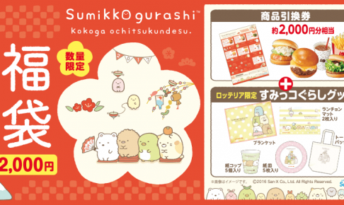ロッテリアから、すみっコぐらしとコラボしたオリジナル福袋『すみっコぐらし福袋』が発売されています。発売は2016年12月26日(月)からの数量限定販売です。すみっこにいるとなぜか“落ちつく”という可愛いキャラたち・・・「…